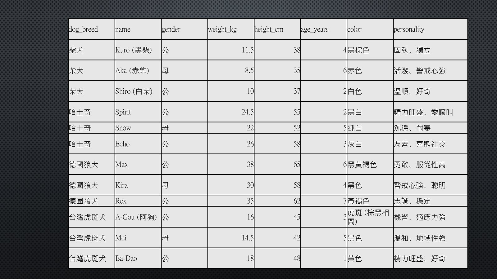 一群狗狗採dict處理屬性與DataFrame處理表格資訊